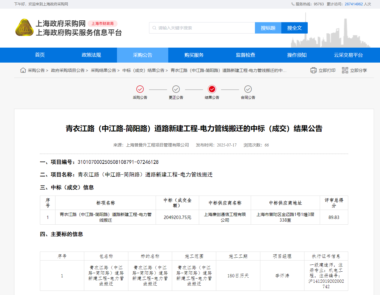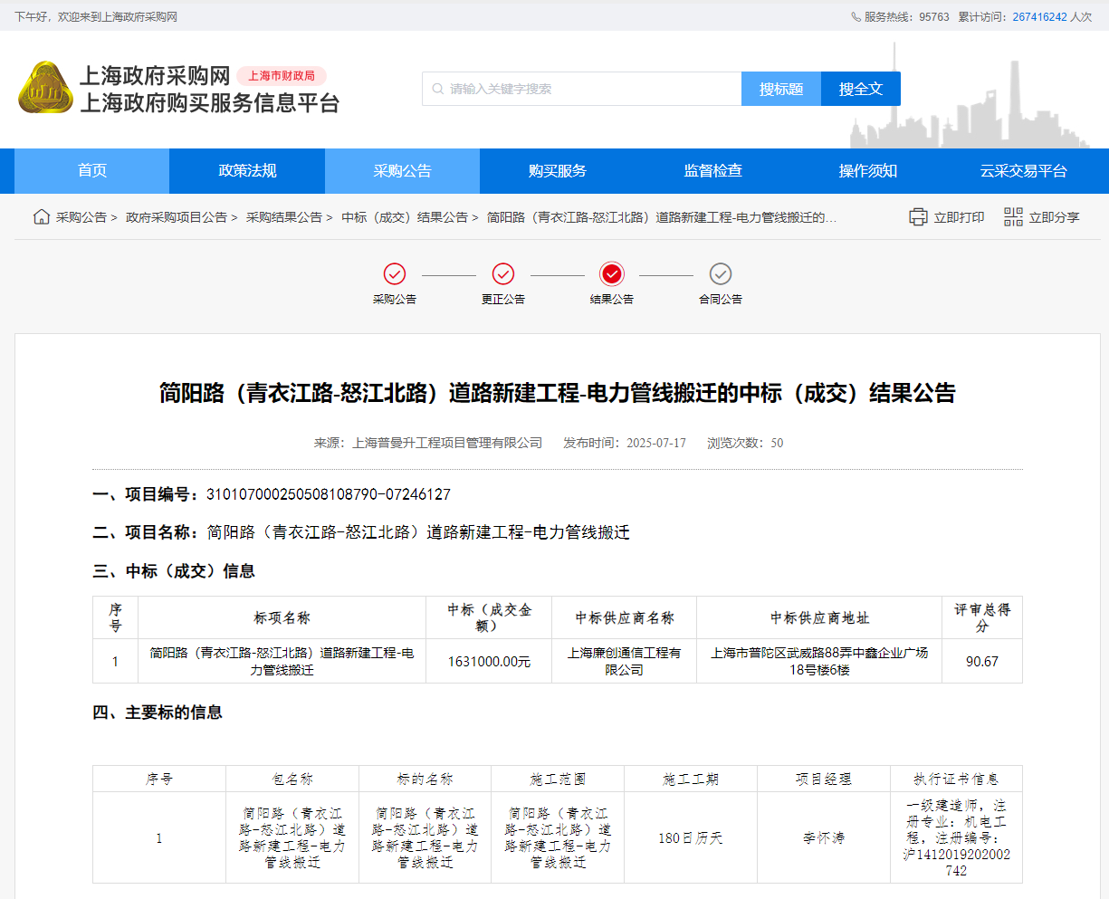 简阳路(青衣江路-怒江北路)道路新建工程-电力管线搬迁的中标(...