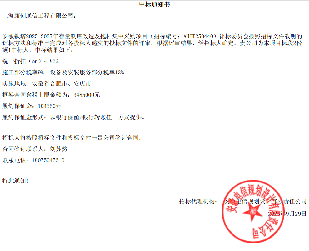 安徽铁塔2025-2027年存量铁塔改造及抱杆集中采购项目中标通知书