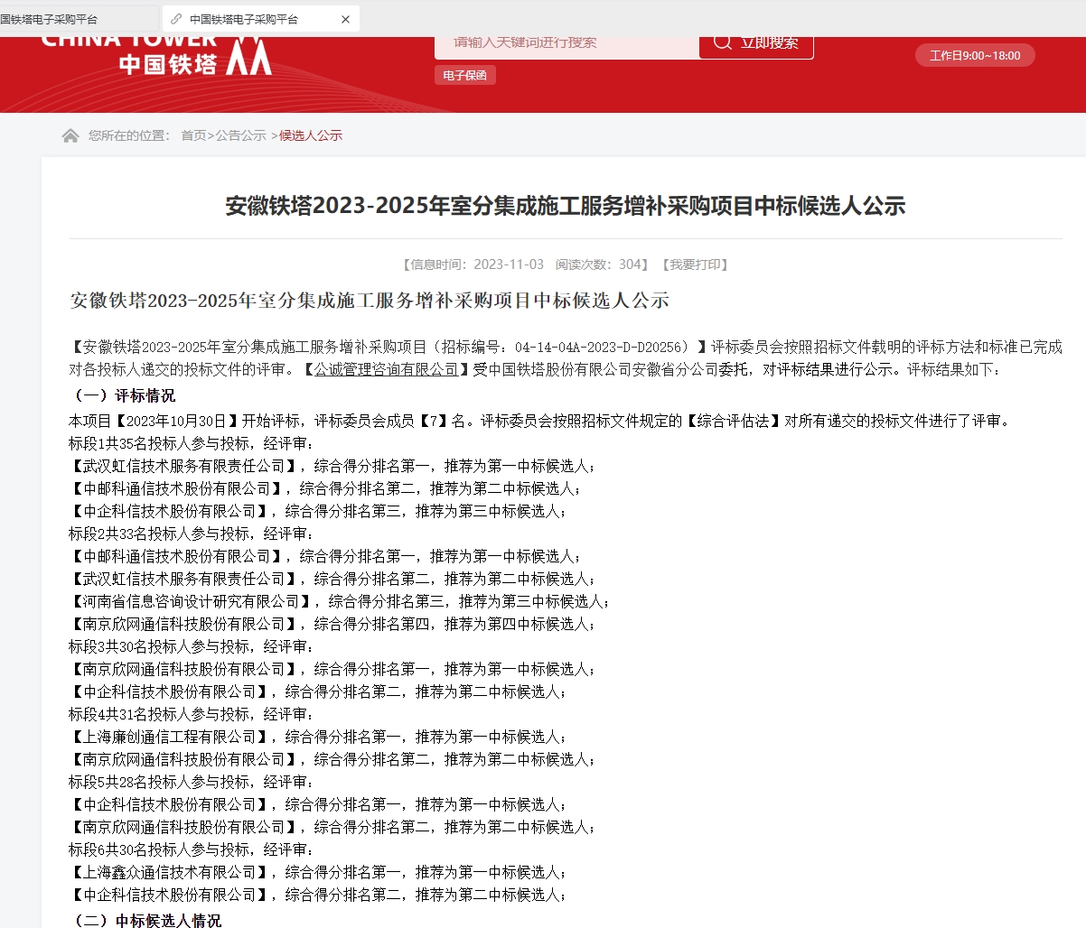 安徽铁塔2023-2025年室分集成施工服务增补采购项目中标候选人公示...