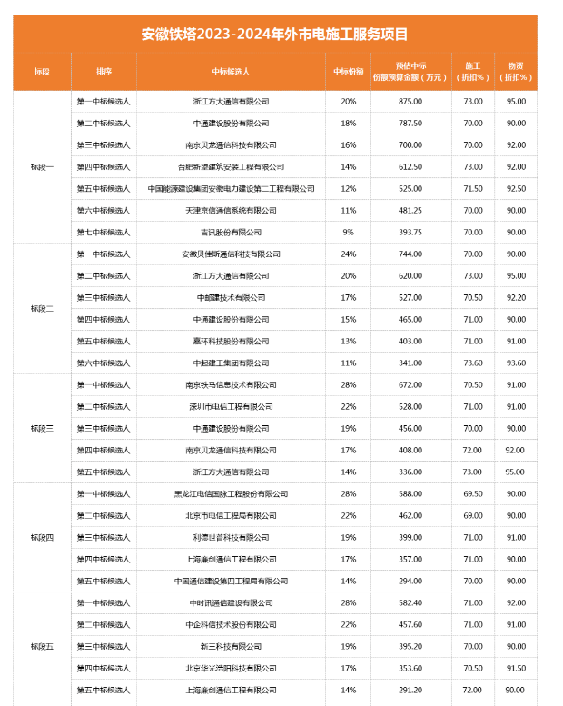 安徽铁塔2023-2024年外市电施工服务项目 标段四、标段五中标