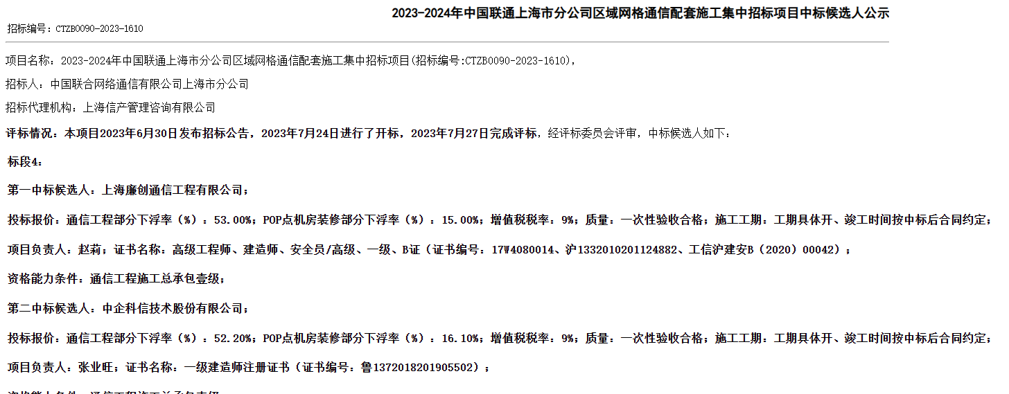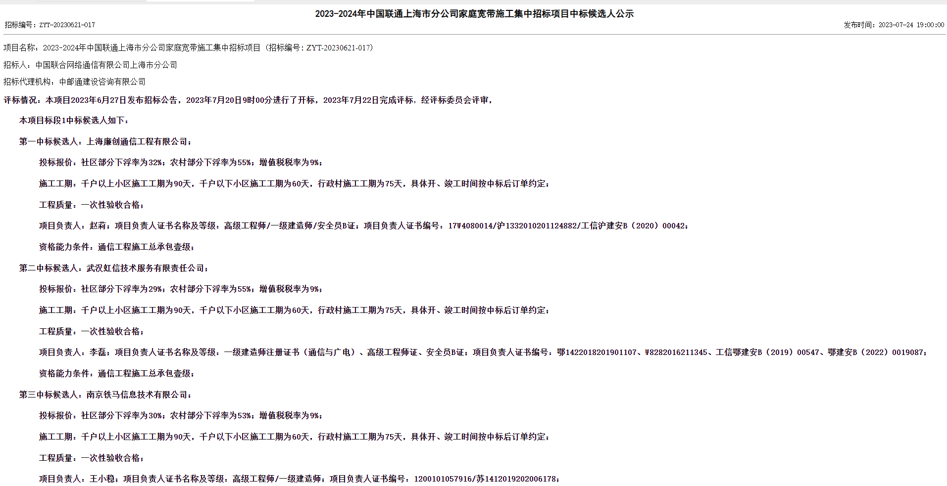 2023-2024年中国联通上海分公司家庭宽带施工集中招标项目中标候选...