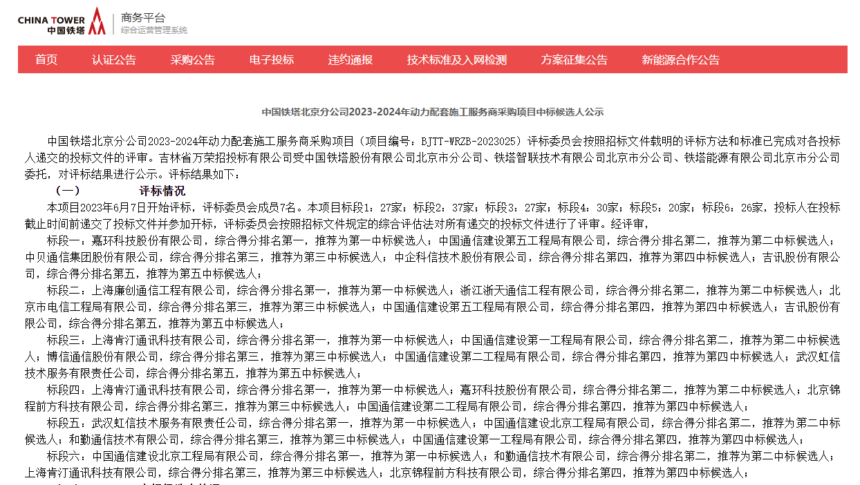 中国铁塔北京分公司2023-2024年动力配套施工服务商采购项目中标候...