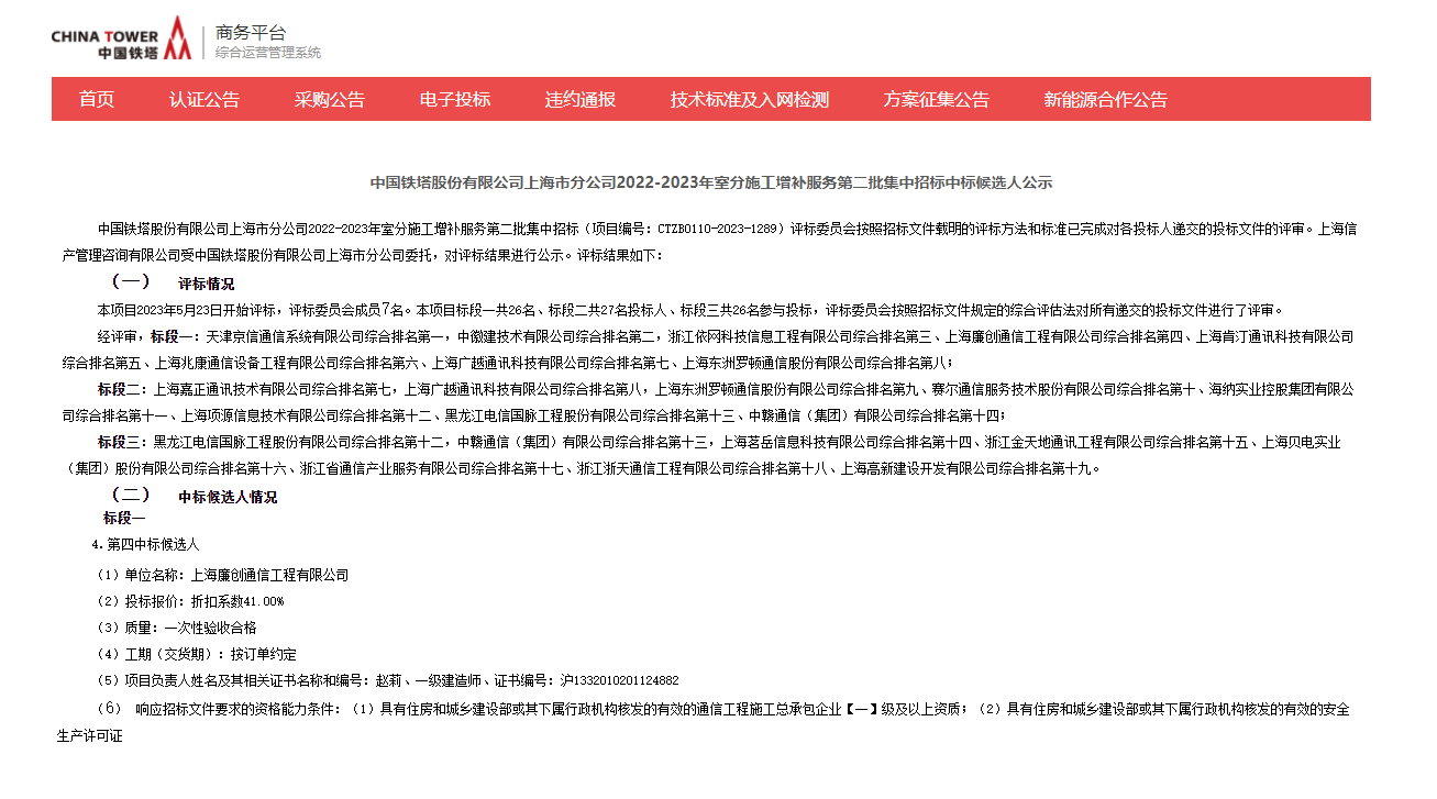 中国铁塔股份有限公司上海市分公司2022-2023年室分施工增补服务第...