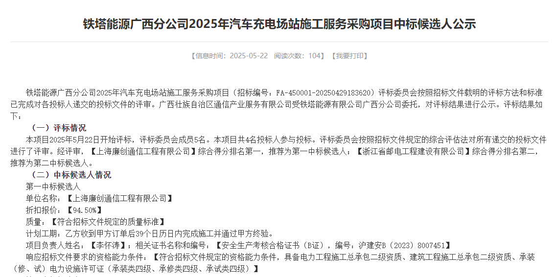 铁塔能源广西分公司2025年汽车充电场站施工服务采购项目中标候选...