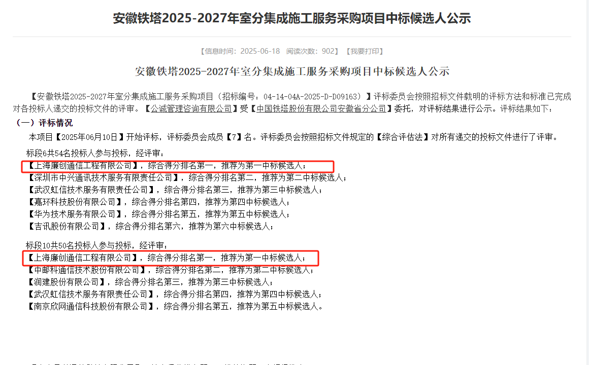 安徽铁塔2025-2027年塔类一体化施工服务项目中标候选人公示