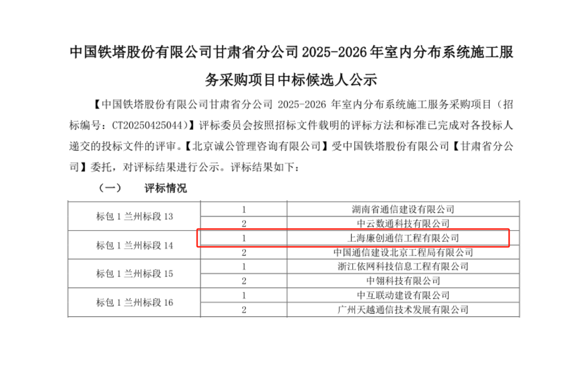 中国铁塔甘肃省分公司2025-2027年塔类一体化施工服务采购项目中标...
