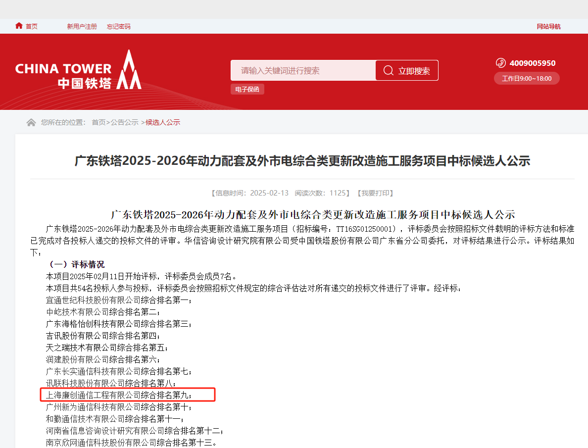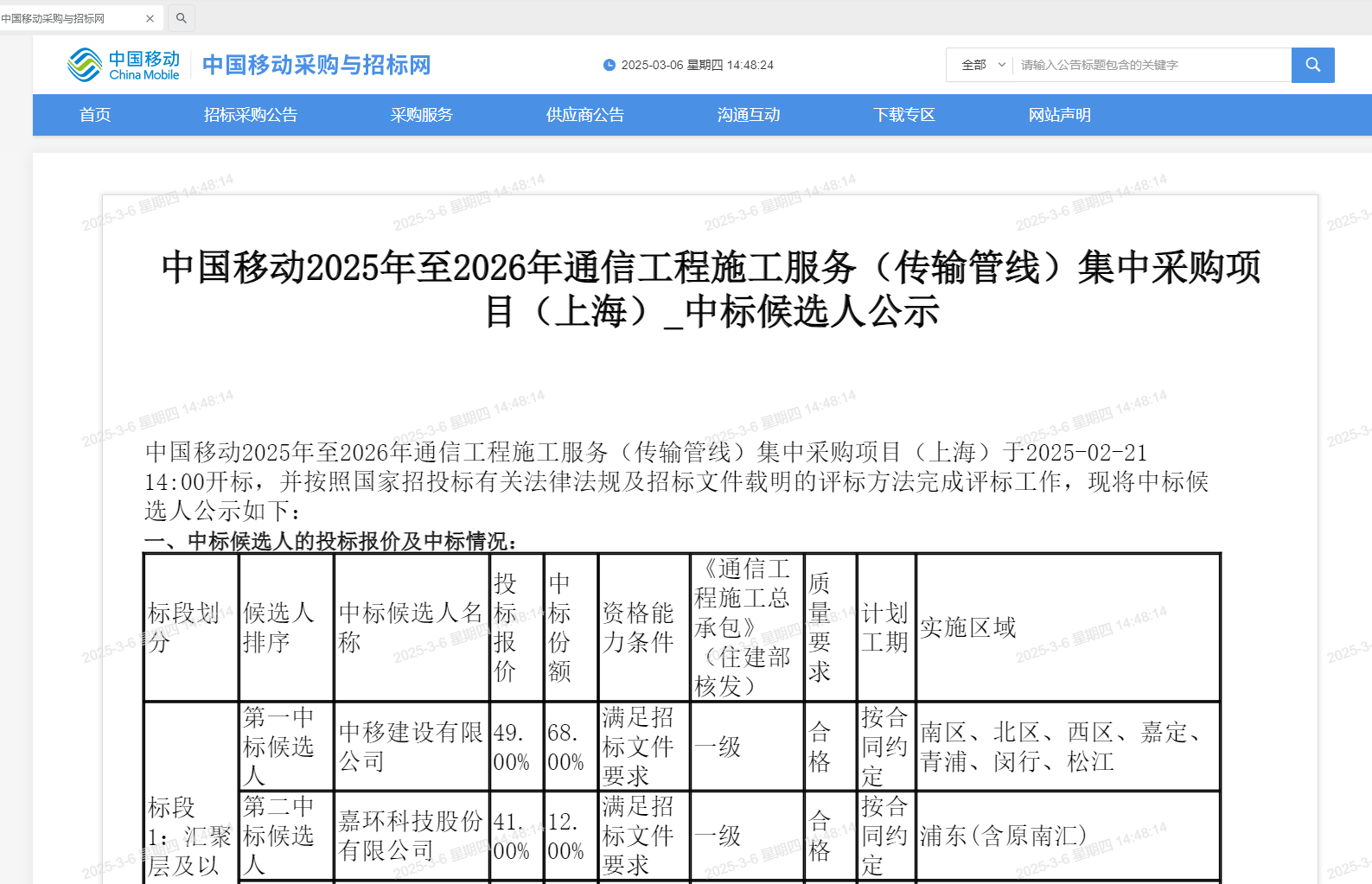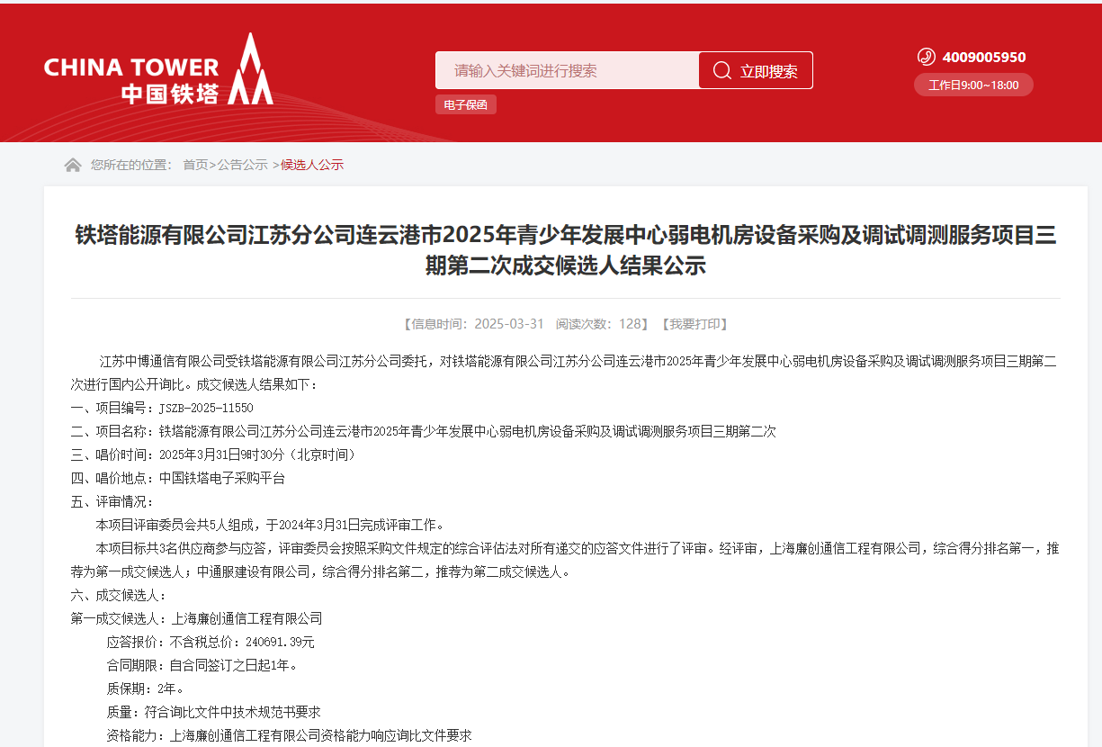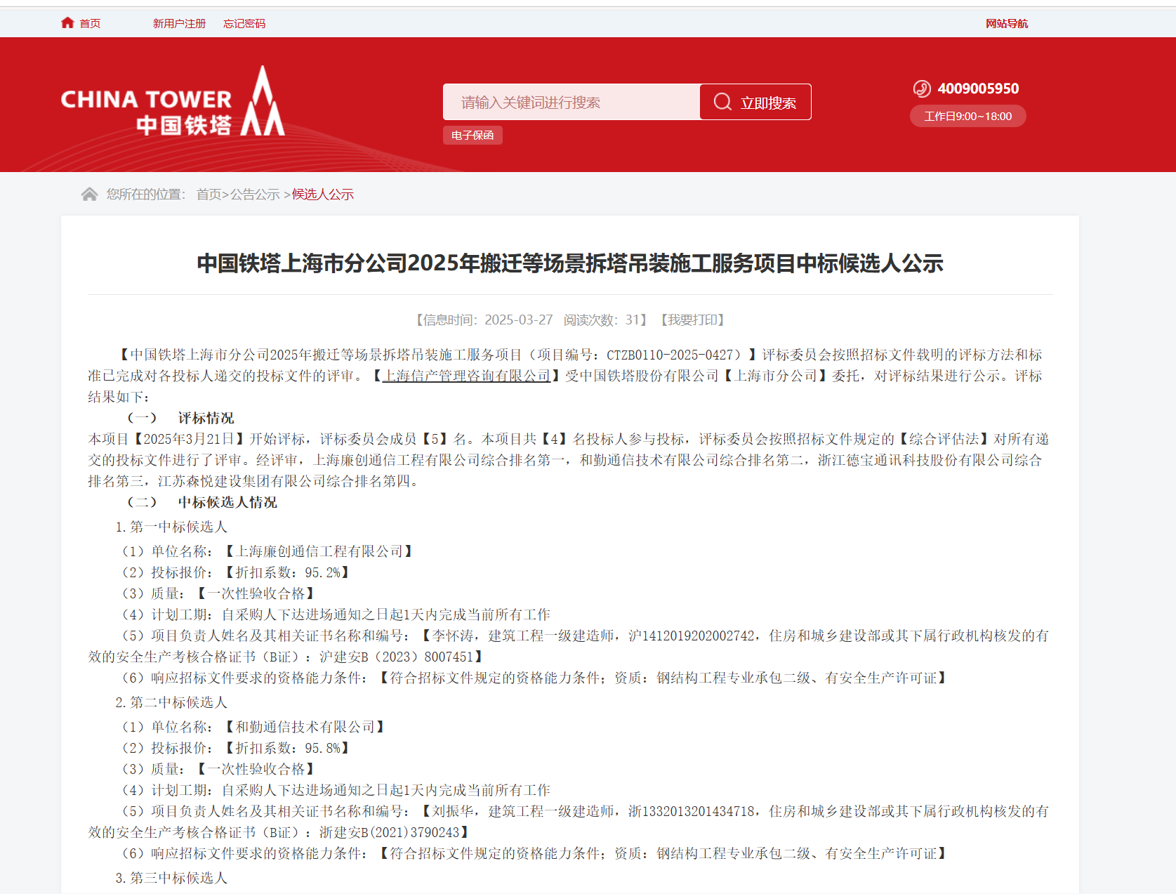 中国铁塔上海市分公司2025年搬迁等场景拆塔吊装施工服务项目中标...