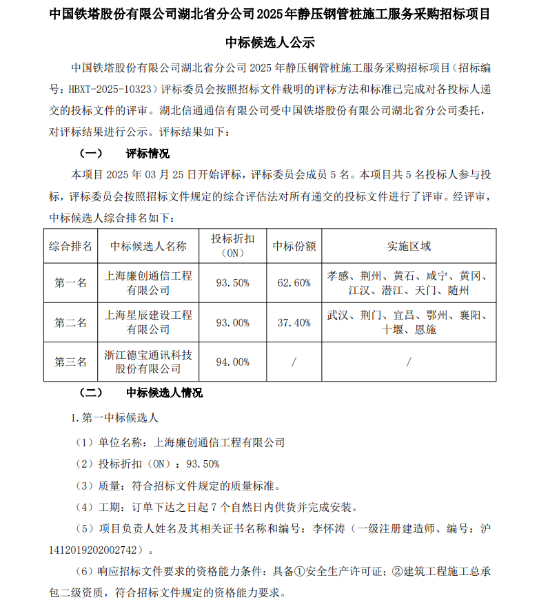 中国铁塔股份有限公司湖北省分公司2025年静压钢管桩施工服务采购...