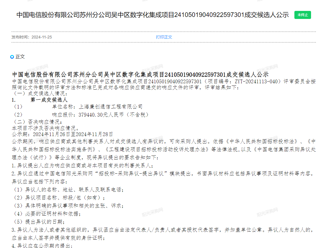 中国电信股份有限公司苏州分公司吴中区数字化集成项目2410501904...