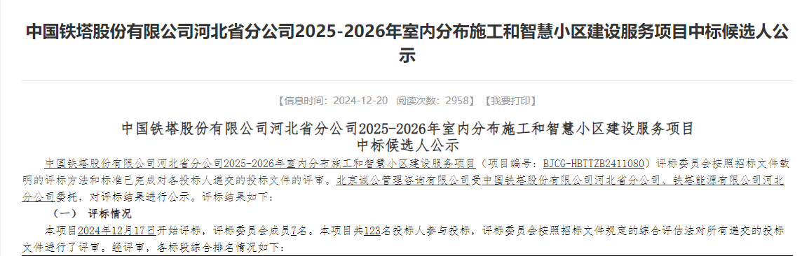 中国铁塔山西省分公司2025年室分综合施工服务采购项目中标候选人...