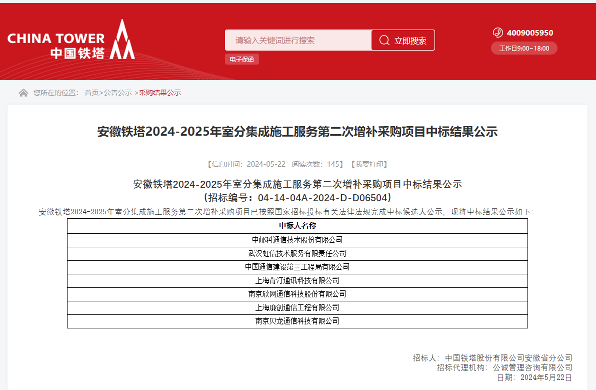 安徽铁塔2024-2025年室分集成施工服务第二次增补采购项目中标结果...